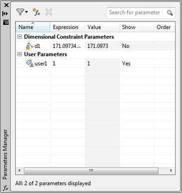 In AutoCAD bring up the parameters manager palette by clicking on the parameters manager button on the ribbon bar in the parametric tab. This palette contains both “dimensional constraint” parameters and the user parameters. The dimensional constraint parameters can be related to the user parameters so that when the user parameter changes, the model is updated.
