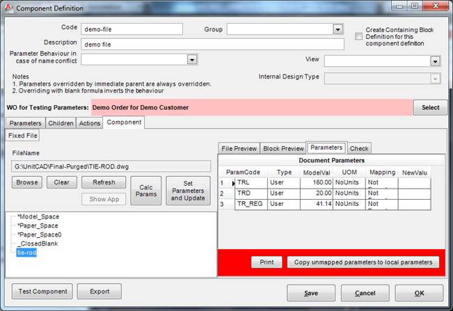 In the Parameters tab, a mapping column shows whether FormulaCAD finds the parameter in the global parameter list or the local parameter list or does not find the mapping at all.