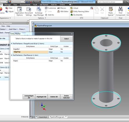 Go to the Component tab and click Browse. Select the file “PipeandFlange.iam” from the samples folder. You may have to change the file type while selecting the file in the Open file dialog box.