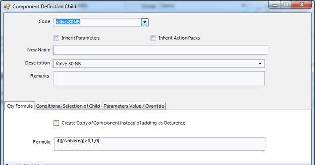 | PipeL | Remember from the Part#2 that this parameter is used by the PipeAndFlange assembly | The formula takes care whether valve Is present or not. Individual pipe length is set such that the total length is equal to specified. |
