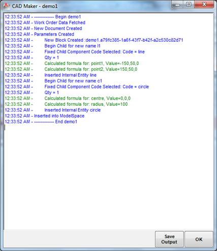 The CAD maker window provides rich information needed by you to trace and find out what’s happening. You can save the output for later viewing by clicking the “Save output” button.