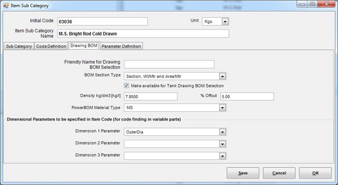 In this screen, we specify information relevant for PowerBOM as defined in the sub category Drawing BOM section.