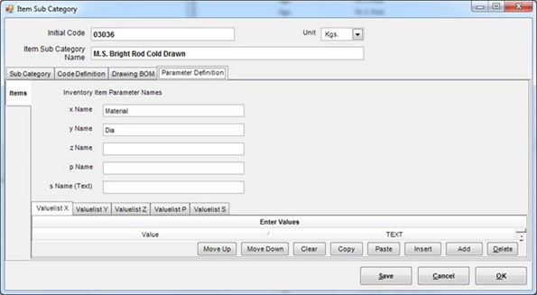 For the above parameter screen, following are the entries made in the sub category.