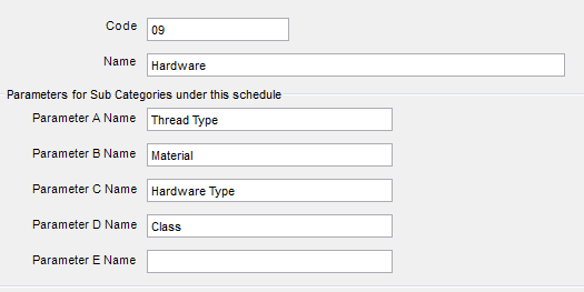Item schedule is the topmost level in the item coding system. Generally, it is kept of two digits. Here parameters can be defined whose values will be filled in the subcategory level.