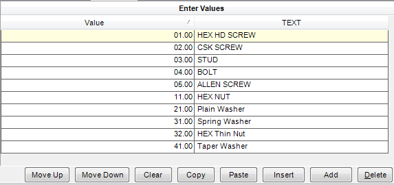 Hardware type has a special meaning. Values 1-11 are main elements (screws/studs/bolts), 11-20 are nut elements, 21-30 are washer elements, 31-40 are locking elements and 41-50 are taper washer elements. Since hardware is usually used in a set (eg. screw/nut/plain washer/ spring washer), hardware selection box is designed to automatically present a set of hardware from each of the above elements thereby allowing you to easily choose the set.