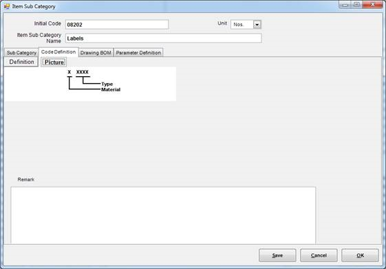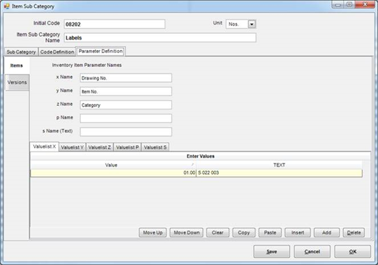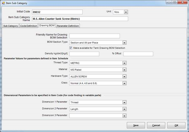 These parameters are used to facilitate easy item selection on the document BOM forms. In the item selection grid, the items are displayed along with the parameter values specified here. These can be used to sort and filter the item code grid to facilitate easy identification and selection.