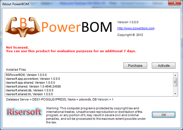 In case you are using PowerBOM in evaluation mode and wish to activate it, you can do it from here. For more information on Risersoft activation, refer to Appendix.