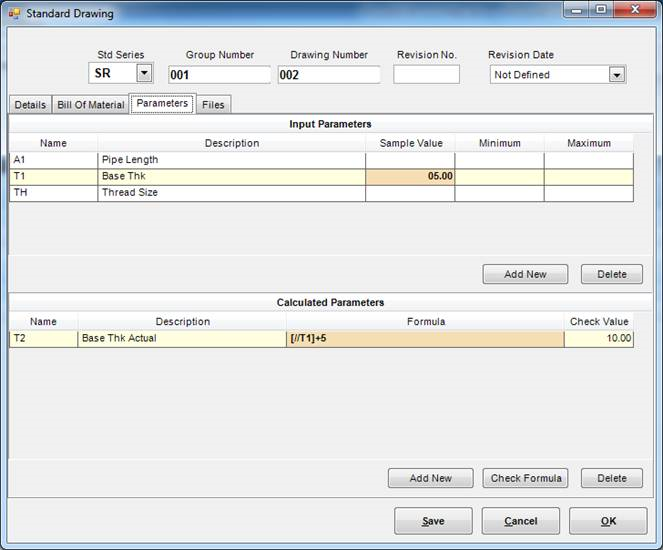 The top portion is used to specify the input parameters. In the bottom portion, we can define formulas based on the input and other calculated parameters. Complete formula language for this is available and given in Appendix.